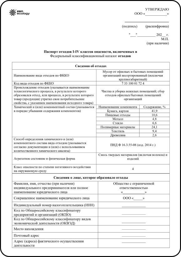 Паспорт отхода - это документ, удостоверяющий принадлежность отходов к соответствующему классу опасности и виду отходов. Так же содержит информацию об их составе и образователе отхода.